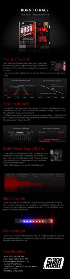 RUSH Tank Racing VTX 5.8G Smart Audio Video Transmitter 20/50/200/500mW for RC Drone Multi Rotor ? Description: Item name: RUSH Tank Racing VTX Input voltage: 7-36V DC Lipo battery: 2-8S Output voltage: 5V 1A Weight: 5.5g ? Package included: 1 x RUSH Tank Racing VTX