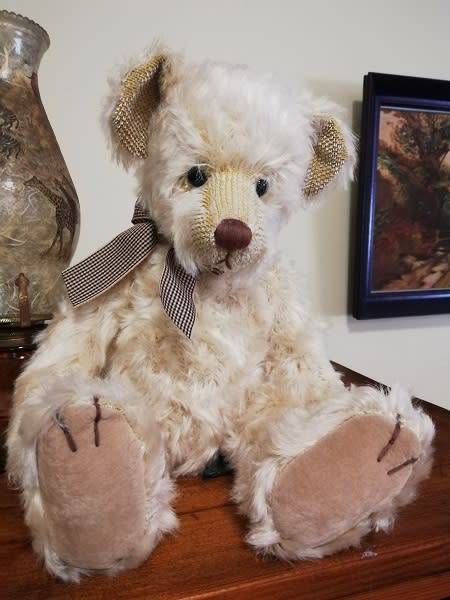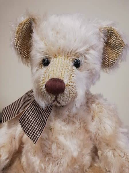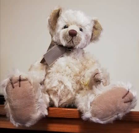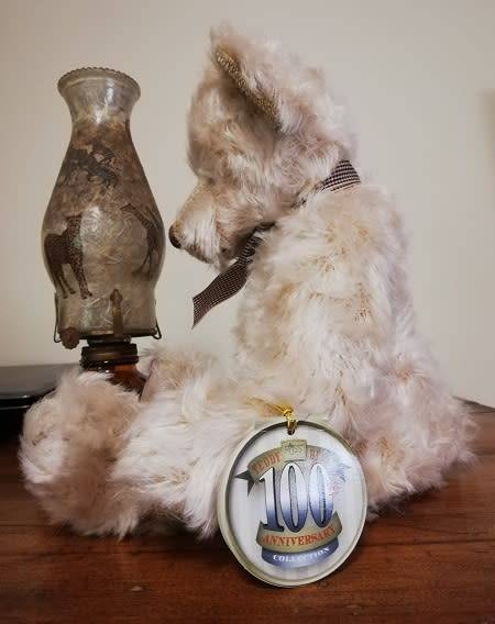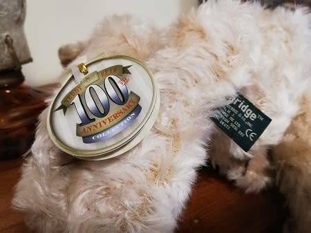 An absolutely beautiful, bear. Claridge is surface washable and soft and cuddly with a brown and cream checkered, plush bow. She measures 40cm tall. Sitting position 32cm. With cardboard 100th Anniversary Collection tags, and the tush name tag. Claridge is in excellent condition.