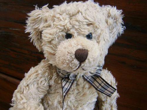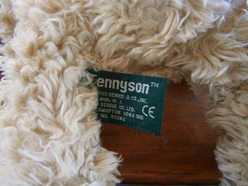 Tennyson is a traditional bear with beige coloured curly fur, black eyes and embroidered puffy brown nose and mouth.