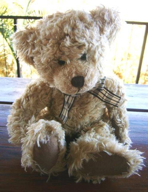 An absolutely beautiful Teddy Bear. Tennyson is surface washable and soft and cuddly with a plaid ribbon. He measures 32 cm tall. Sitting position 20 cm.