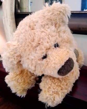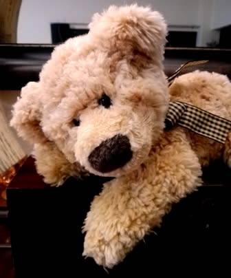 An absolutely beautiful, small little bear. Nickelby is surface washable and soft and cuddly with a gingham, plush bow. He measures 33m long. Height 18cm.