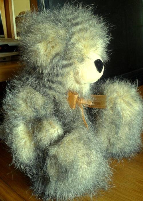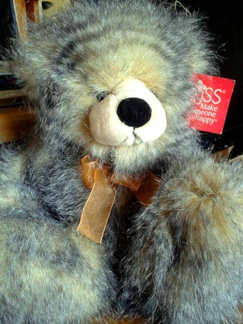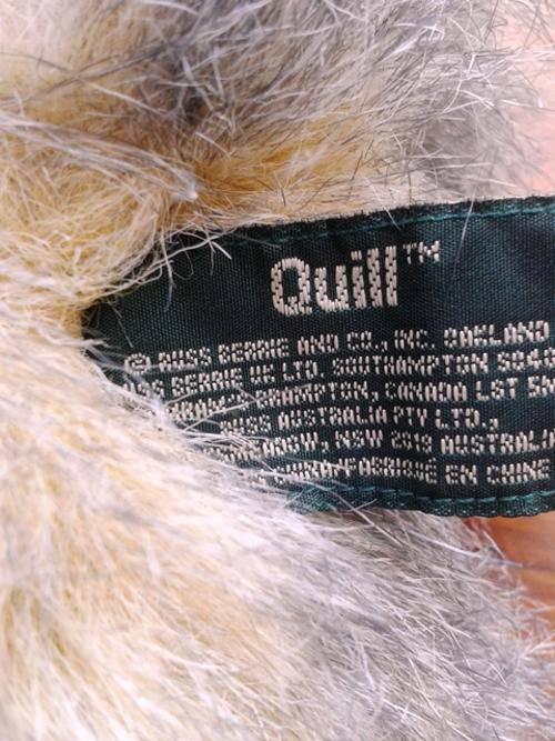 Quill is a beautifully soft and silky two-toned fur teddy bear...he is a combination of silvery-gray and tan. This stuffed bear sits with the help of beans in his behind and wears a bronze colored organza ribbon around his neck. He is surface washable. Not jointed and 30cm in height.