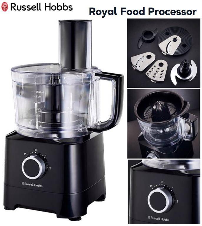 Russell Hobbs Royal Food Processor Black-500w Processing Power , 2 X Speed Control With Pulse For Precise Start And Stop Control, - 1x Plastic 1.4 Litre Food Processing Bowl, 1x Stainless Steel Slicing Blade, 1x Stainless Steel Shredding Disc, 1x Stainless Steel Chip Slicing Disc, 1x Citrus Juicing Attachment, Double Safety Lock System, Nonslip Rubber Feet For Stability, Retail Box 1 Year Warranty