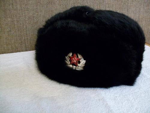 Issued to USSR troops since 1940, replacing the Budenovka Helmet during winter months. The Ushanka was either made in sheep skin and wool ( which was cheaper to produce in mass quantities, or in Muskrat Fur, which was used by officers or for ceremonial dress, as in Military Parades )