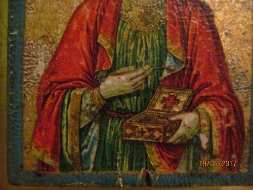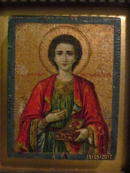 SAINT PANTELEIMON IS CONSIDERED A HEALER. THE CROSS PAINTED ON THE MEDICINE BOX HE IS HOLDING SYMBOLIZES THAT HE IS A MARTYR AS WELL AS SYMBOLIZING THE PERFECT SACRIFICE OF LIFE FOR OTHERS IN CHRIST'S OWN CRUCIFIXION. THEREFORE SAINTS WHO WERE MURDERED FOR CONFESSING THE FAITH ARE DEPICTED ON ICONS WITH A CROSS.