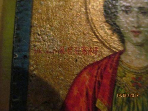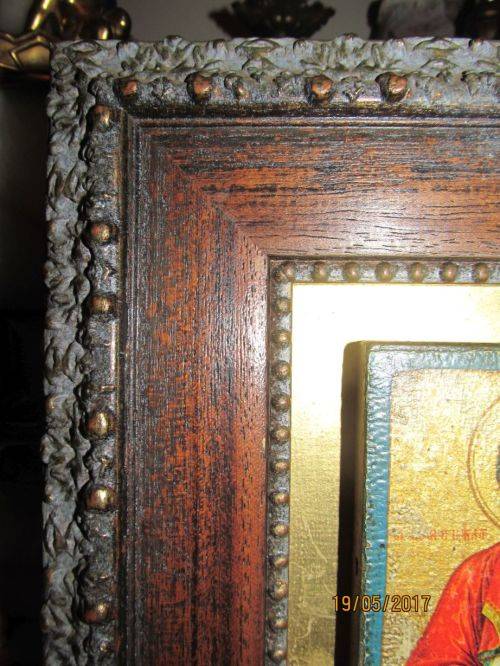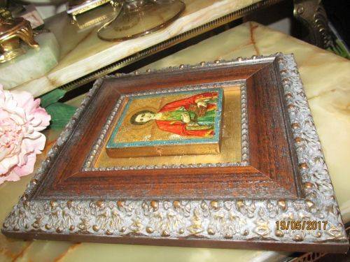 THE ICON ITSELF IS HAND PAINTED ON WOOD AND HAS THEN BEEN MOUNTED UPON A VINTAGE WOODEN FRAME. THIS FRAME DOES HAVE WIRE SO THAT IT MAY BE DISPLAYED
