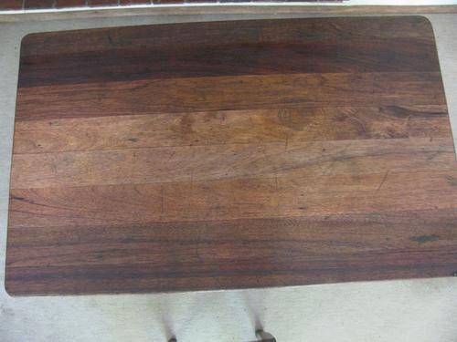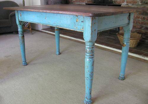 Old rustic table with a solid meranti table top (not entirely sure about the undercarriage). The old, partly chipped off and scratched paint was left intact as well as old nail holes (from not so well executed prior repairs). Having said this, the table is very sturdy. The top is in quite good condition with a few scratches, tiny marksÃÂ and small patches of discolouration. The table is a generous 4 seater and can seat 6 at a push. Size 74cm high, 1.34m wide, 93cm deep. The chairs are for illustration only and not part of the deal.