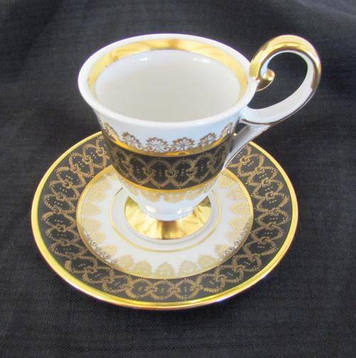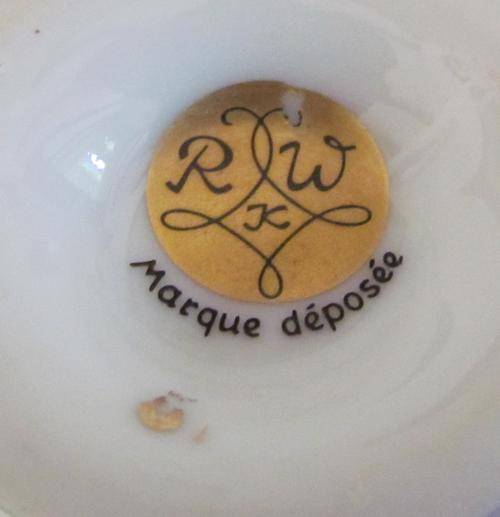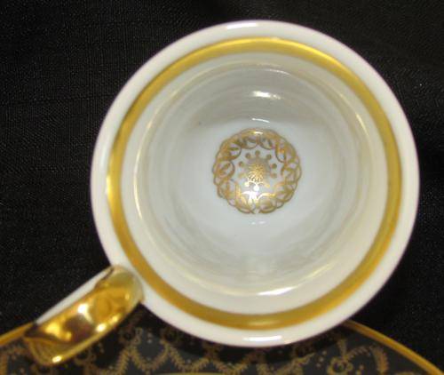RWk Marque Deposee 5 Footed Demitasse Coffee Cup & Saucer=White ground=Gild & Black pattern =France.