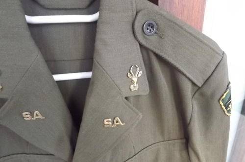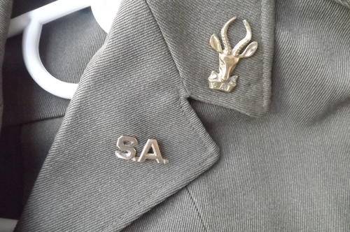 S.A Army short combat jacket by Ensign Ltd 1969 in Pure New wool.Chest 102cm.Middle 78cm.Two x SA I Infantary +- 1967 shoulder cloth patches and brass SA I bokkie badges.Very good condition