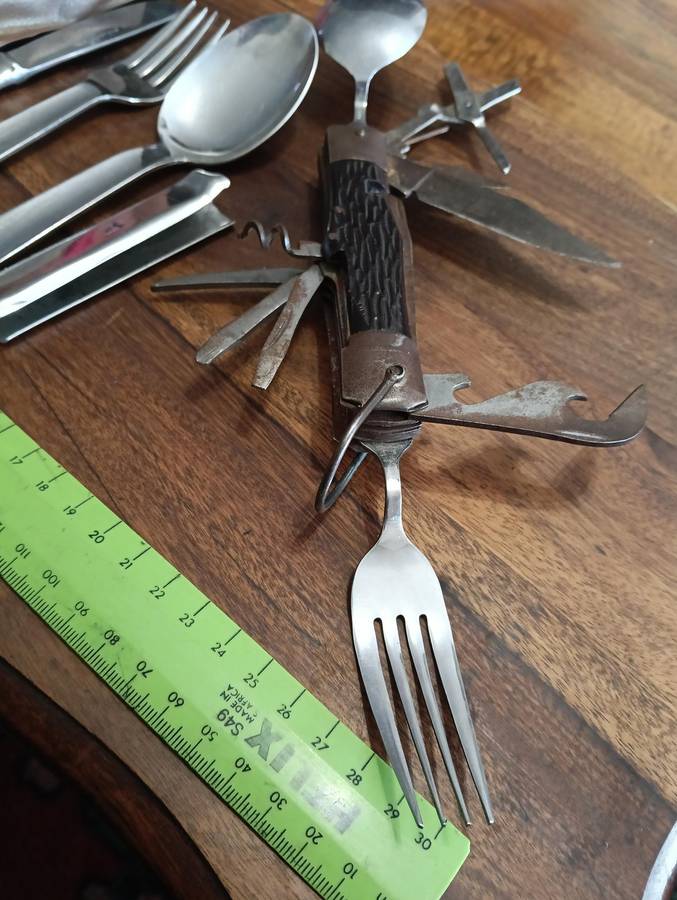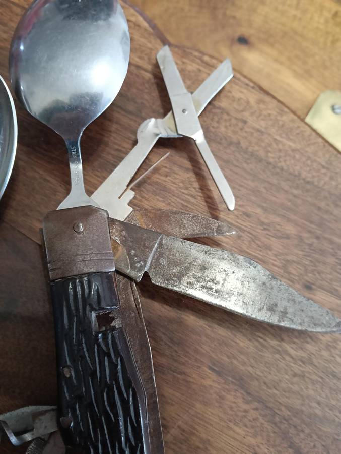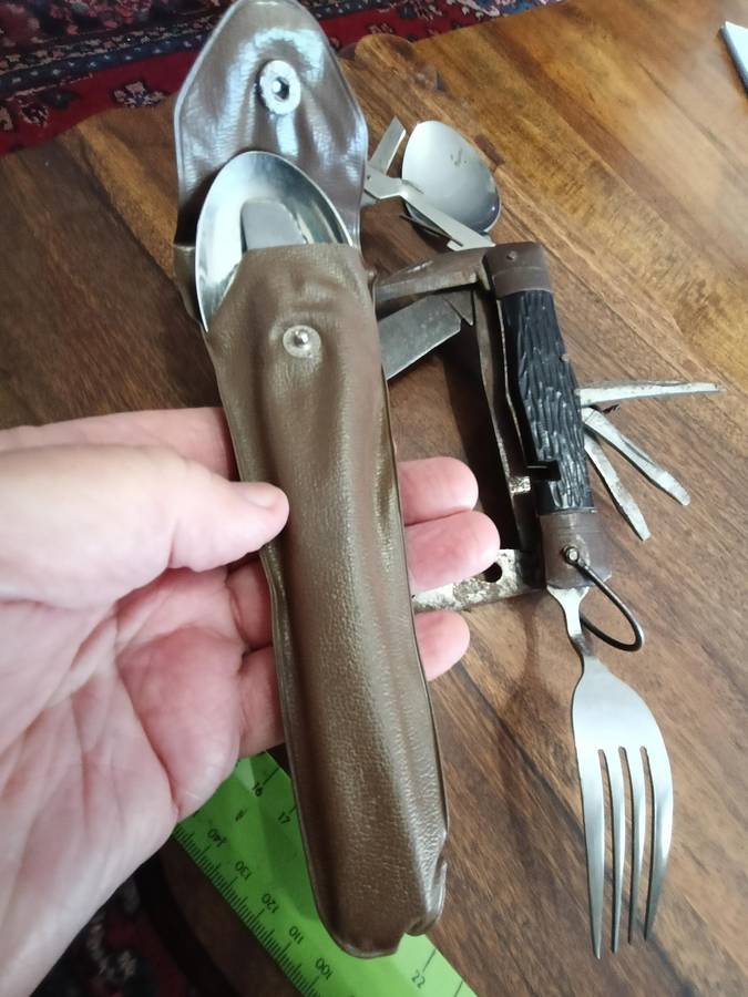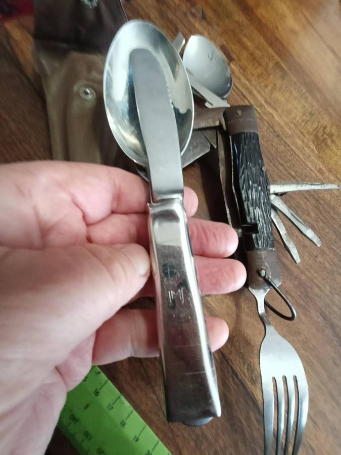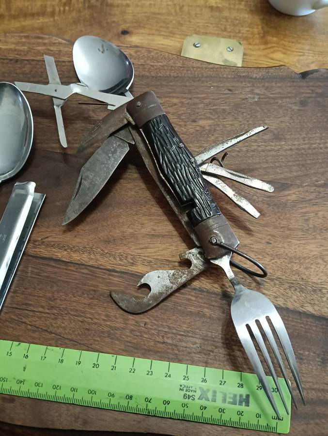 OLD S A D F MESS KIT, KNIFE SPOON AND FORK SET. TOGETHER WITH A VINTAGE MULTI TOOL/SURVIVAL KNIFE.