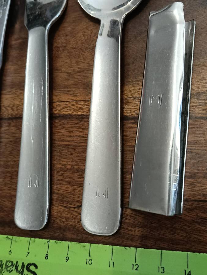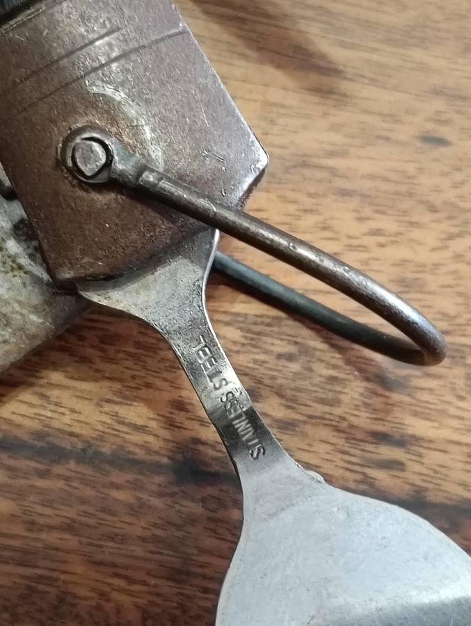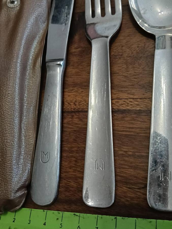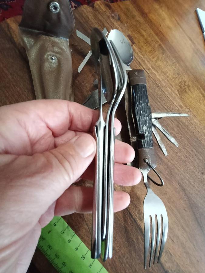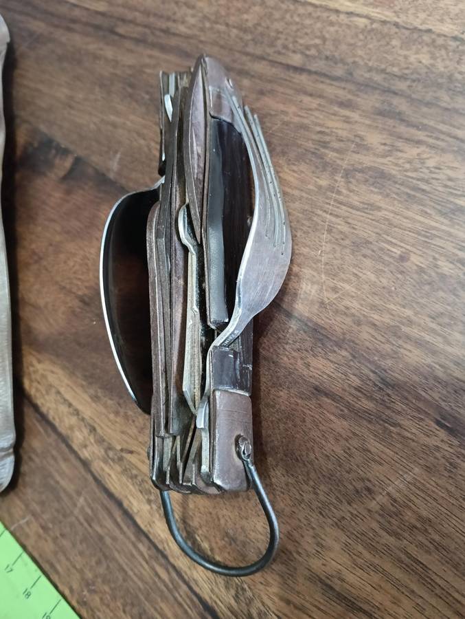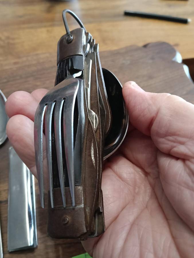 OLD S A D F MESS KIT, KNIFE SPOON AND FORK SET. TOGETHER WITH A VINTAGE MULTI TOOL/SURVIVAL KNIFE.