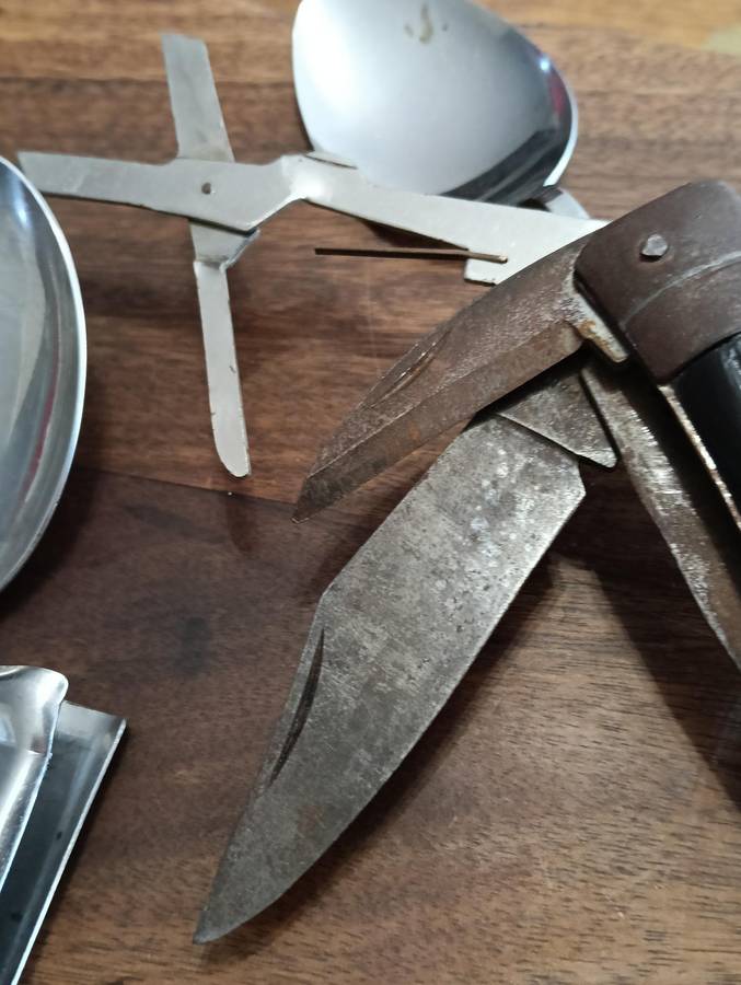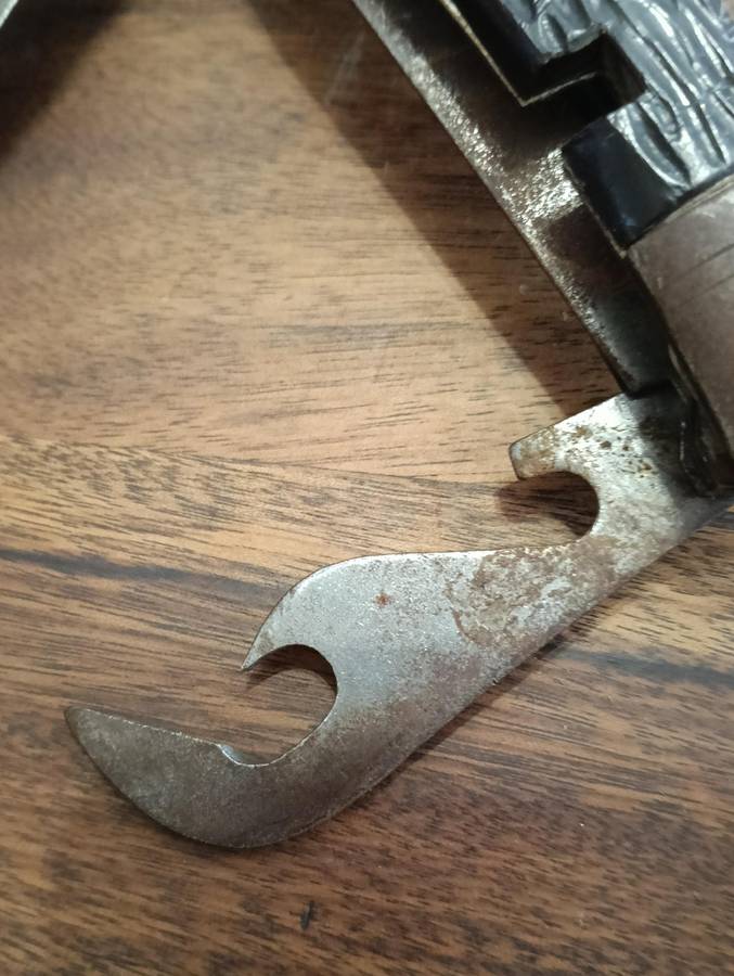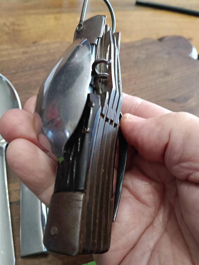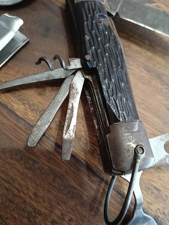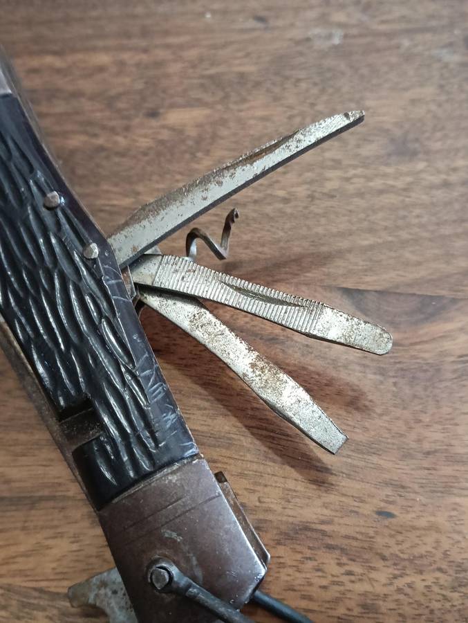 THE MULTI TOOL NEEDS TO BE CLEANED, HAS SOME SURFACE BROWNING, AND THE CORK SCREW HAS LOST IT'S POINT.