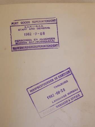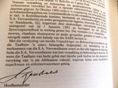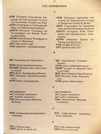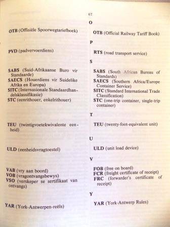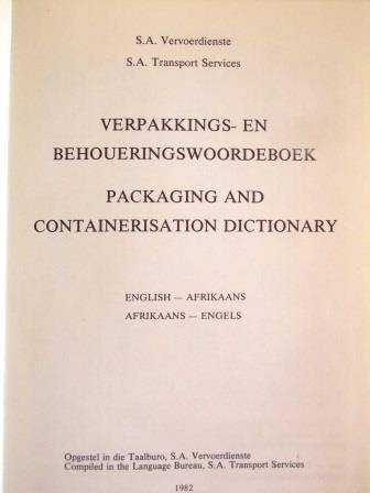 S A TRANSPORT SERVICE PACKAGING AND CONTAINERISATION DICTIONARY/S A VERVOERDIENSTE VERPAKKINGS- EN BEHOUERINGSWOORDEBOEK 1982. SHIPPING COSTS R55.00 www.bidorbuy.co.za/seller/1936279/Hartie