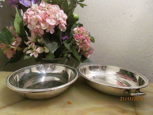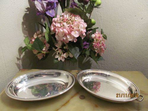 A VINTAGE SILVER PLATED CASSEROLE / VEGETABLE / SERVING DISH WITH AN OVAL SHAPE AND LID WITH A PAIR OF HANDLES ATTACHED ON THE LONGITUDINAL SIDES GRANTING THE ITEM THE DUAL ABILITY OF FUNCTIONING AS TWO SEPARATE SERVING DISHES