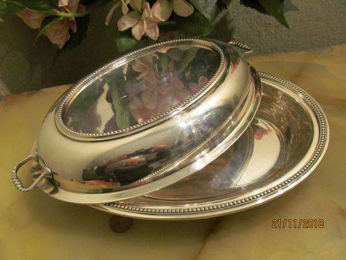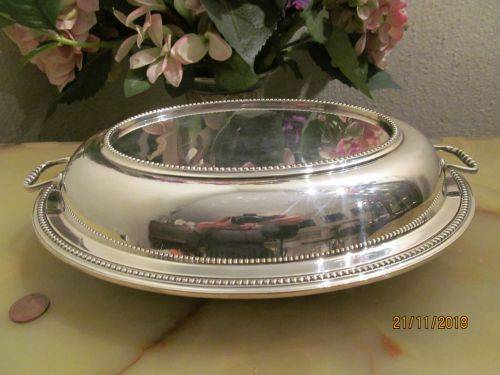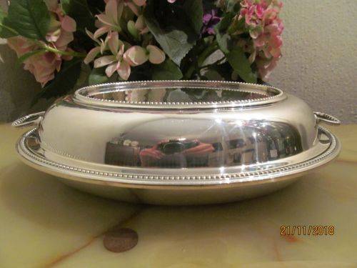 VINTAGE SILVER PLATED OVAL SERVING / VEGETABLE / CASSEROLE DISH WITH LID & HANDLES - S & J LEVI, BIRMINGHAM (1900 - 1935)