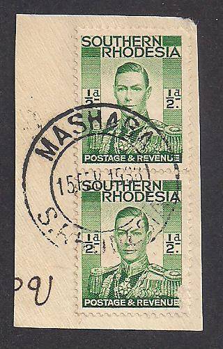 Southern Rhodesia KGVI ½d pair on small piece with MASHABA / S.RHODESIA double-ring datestamp. As scanned