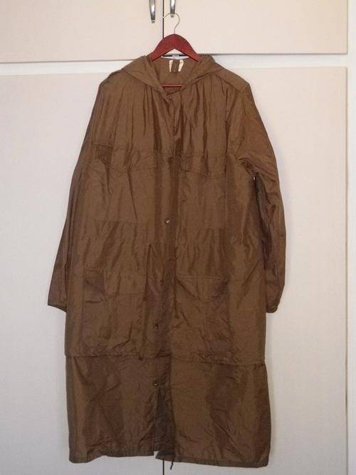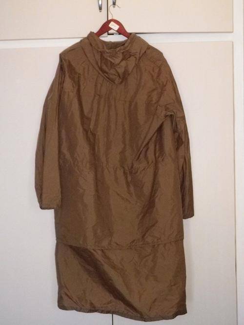 Made from light weight nylon, this suits includes hood, 4 pockets, 2 drawstrings, a front zip and fold up extension. Size XL, made in 1981 - a good piece.