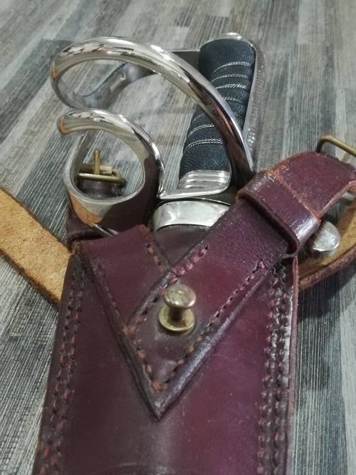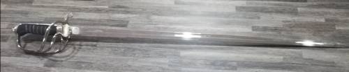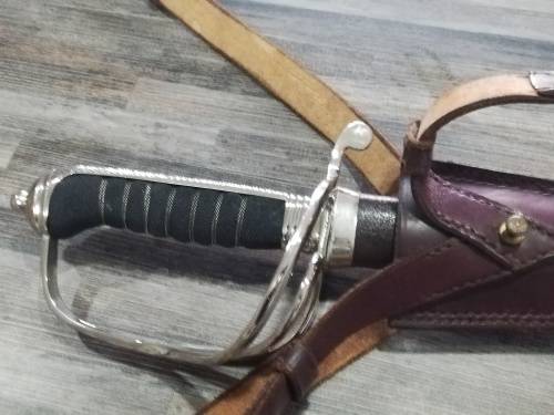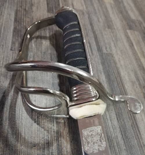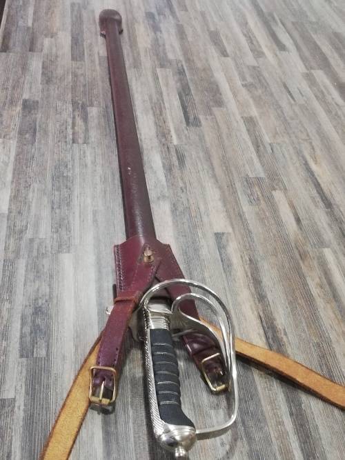 SA POLICE PRE 1994 CEREMONIAL OFFICERS SWORD, WITH LEATHER SCABBARD.THE OLD COAT OF ARMS IS ETCHED ON THE ONE SIDE OF THE BLADE AND THE MANUFACTURERS NAME GMS SOLINGEN OF GERMANY IS ON THE OTHER SIDE OF THE BLADE. THIS SWORD WAS ISSUED TO ALL OFFICERS BELOW THE RANK OF GENERAL.