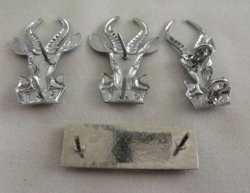 SA RECCES / SADF SPECIAL FORCES MEMBERS BERET INSIGNIA AND 2 X COLLARS - SMALL SPRINGBOK HEAD IN CHROME WORN POST 1985 WHEN THE SPRINGBOK HEAD WAS REPLACED BY COMPASS ROSE - 2 X BADGES WITH 2 PINS EACH - THE OTHER ONE WITH LUGS