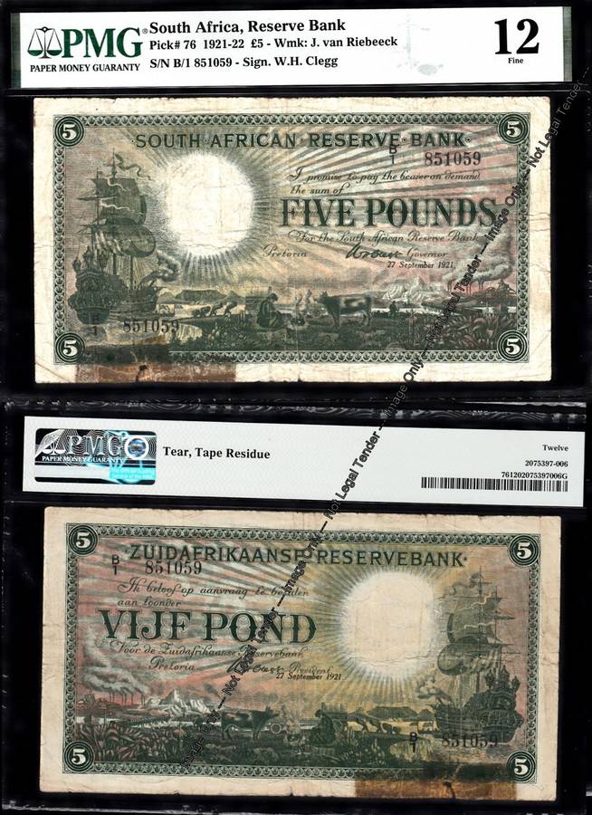 SA Reserve Bank Five Pounds: CLEGG: 27 September 1921: PMG 12 Fine
