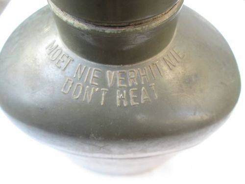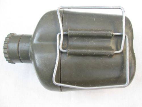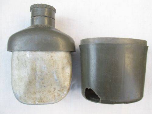 South African manufactured Patt. 61 aluminium 1L water bottle with plastic canteen; also used by the Rhodesian Army and SAP during the Bush War. Has crisp bi-lingual Don't Heat warning and UM. Good, field-used condition as pictured; note rodent damage and replaced wire handles. Tracked postage is R65.00.
