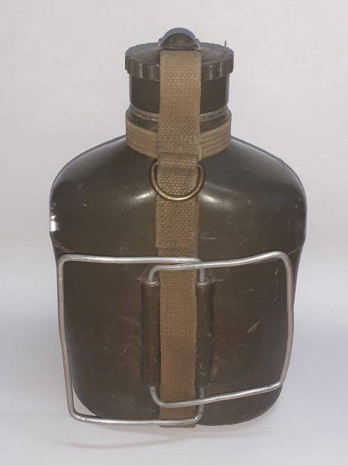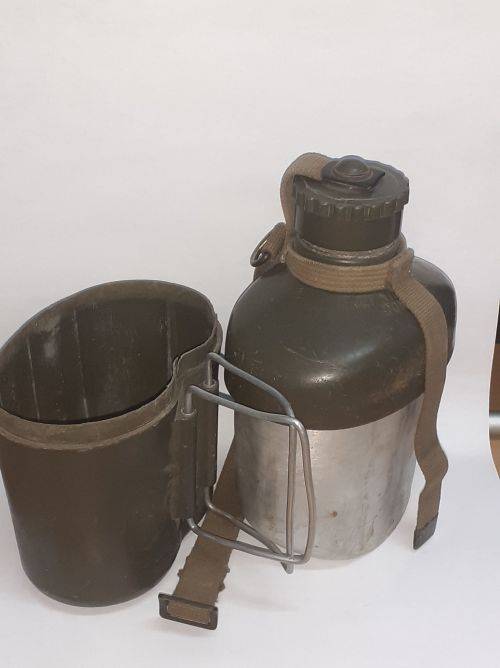 South African manufactured Patt. 61 aluminium 1L water bottle with plastic canteen; also used by the Rhodesian Army and SAP during the Bush War. Includes correct canvas carry straps. Very good original, field-used condition as pictured, the cap has a crack which can be easily repaired. Tracked postage is R85.00.
