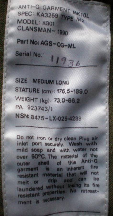 SAAF FIGHTER PILOTS G-SUIT LABELLED&DATED 1990-SIZE MEDIUM LONG-USED BY 1 SQUADRON MIRAGE FI PILOTS-