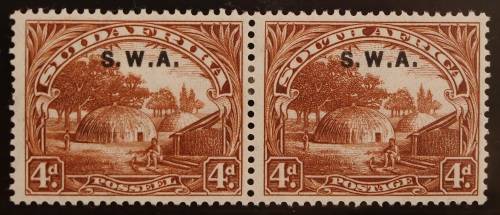 SACC 85: South West Africa. 1927- 1930. London Pictorials of S.A. 4d brown pair, overprinted "S.W.A." MH. Leftover of hinge on back. Still in very good condition. Bargain!