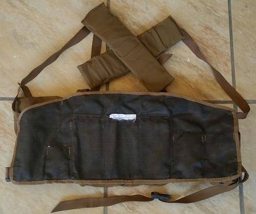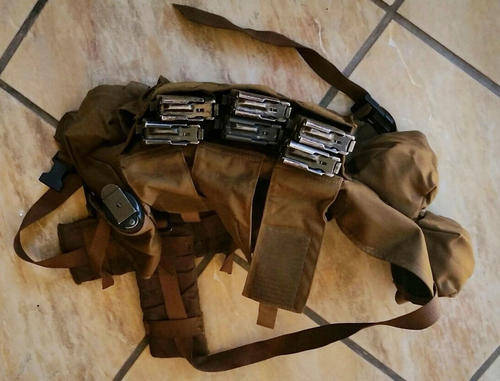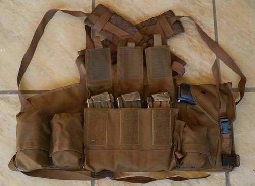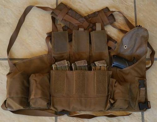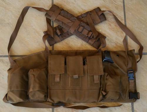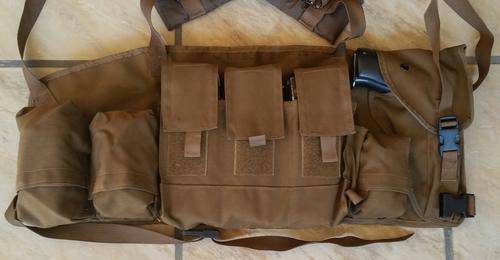 This set of chest webbing can contain 6 x R4 magazines has three additional pouches as well as a pistol holster.