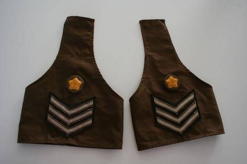 SET PAIR OF SADF -- ARMY RANK SLEEVES. STAFF/SERGEANT . EMBROIDERED TYPE ON NUTRIA BROWN WITH REMOVABLE RUBBER CASTLE. VERY GOOD CONDITION. BUSH WAR ERA.