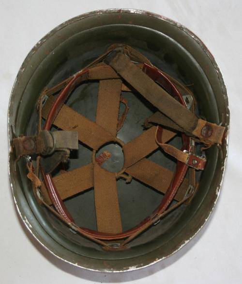 SADF - ARMY STEEL HELMET COMPLETE WITH REMOVABLE PLASTIC INNER LINER. KNOWN AS: "STAALDAK & DOIBY" . FRENCH "OTAN" PATTERN. STANDARD HELMET THROUGHOUT 1970's AND EARLY 80'S , UP TO 1983.