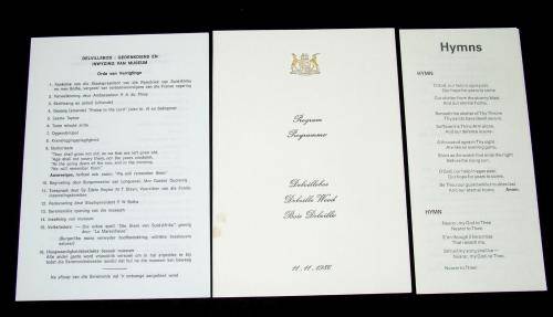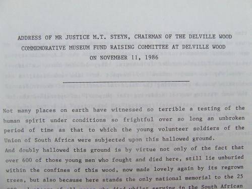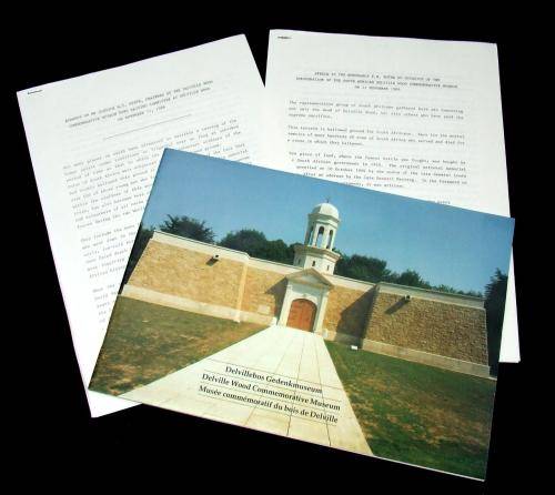 Up for auction is a folder with contents as issued to the delegates at the inauguration of the SADF Delville Wood Commemorative Museum in France on 11 November 1986. Package consist of a tri-lingual folder, a programme with order of service pamflet and hymn sheet, a colour 24 page broshure and a copy each of the speeches of P.W Botha and Justice M.T. Steyn.