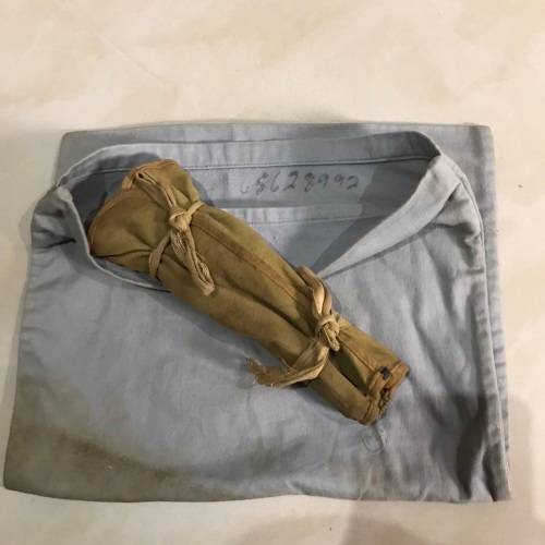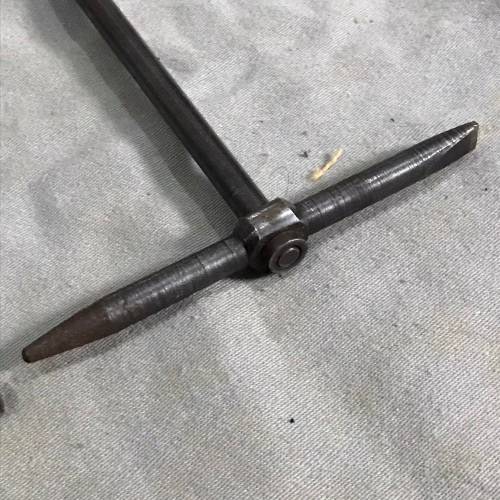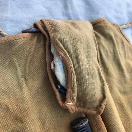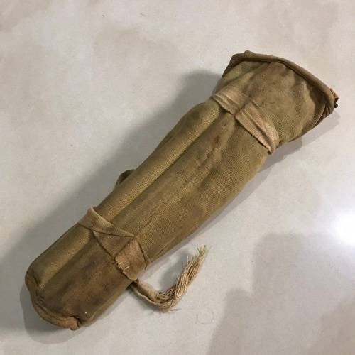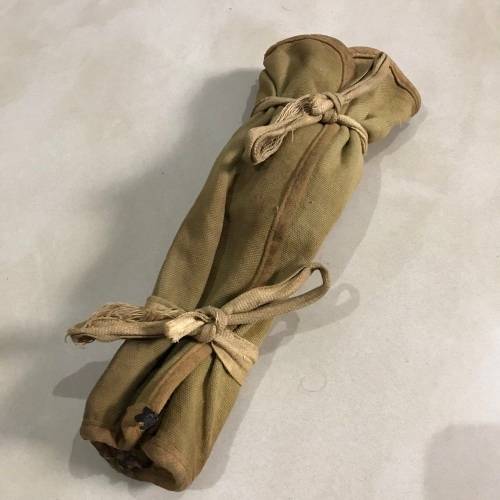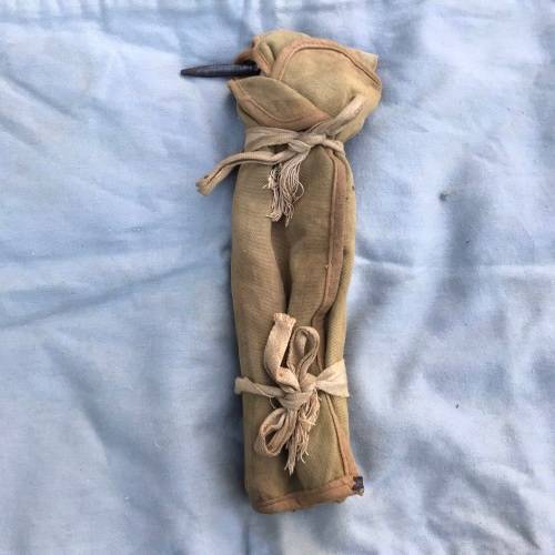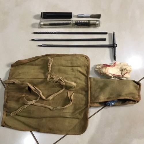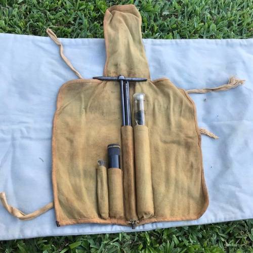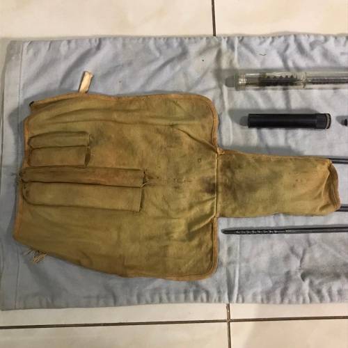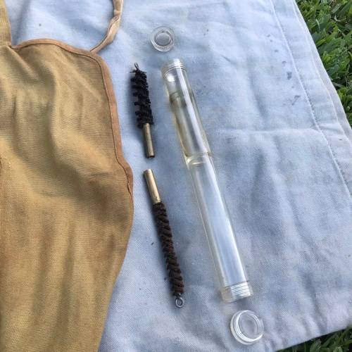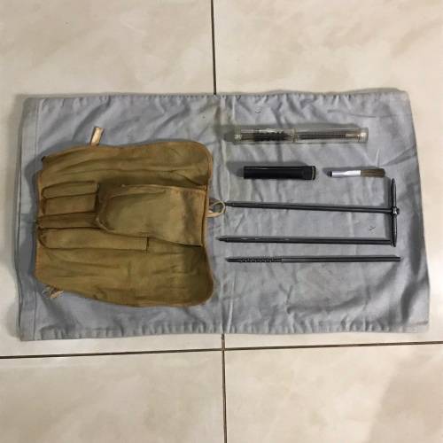 This early, South African army rifle cleaning kit consists of: a T-handle three-piece rod/pull through, a clear tube with two-barrel brushes, a nylon brush, an oil container, 2x4 patches, plus extra rolled up work cloth. Other than discolouration to the pouch, it's in great condition.