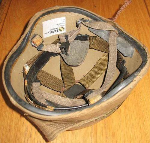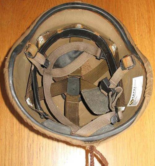 helmet and cover Fibre helmet of 'Nutria' brown shade, of similar appearance to the US PASGT style, complete with removable cover (of nutria shade), fitted with and adjustable peak. Inside, the helmet features a canvas cradle liner system and has a rubber bumper fitted to the rear with a circular pad fitted to the inside crown. The canvas chinstrap is secured to the helmet at three points.