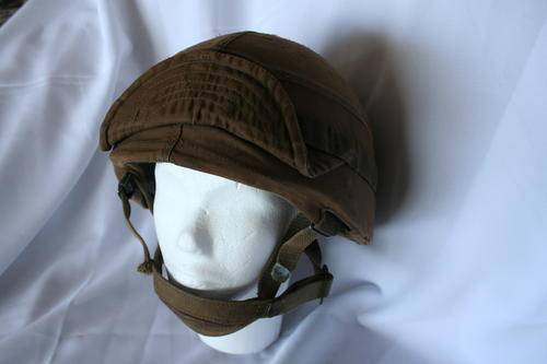 SADF PATTERN 1983 KEVLAR HELMET COMPLETE WITH NUTRIA CLOTH COVER. SOLDIERS NAME IS WRITTEN UNDER THE FRONT FOLD DOWN VISOR. ALL BELTS, BUCKLES ARE OK. THE CLOTH HAS SOME SMALL NICK MARKS ON TOP.