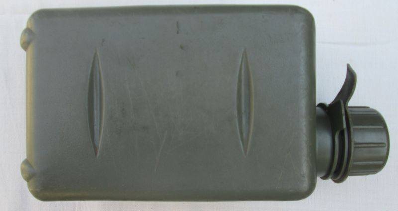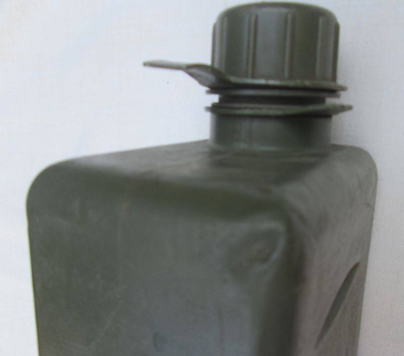 2 liter SADF water bottle in olive green plastic. Wide necked type. User by Recce members; sterile item- has no manufacturer's marks to the base of the bottle, unlike the general issue ones. Very good original condition, as pictured. Has a tiny split to one corner that can be melted closed. Tracked P&P is R30.00.