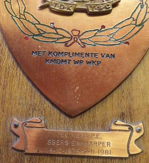SADF Technical Services Corps plaque awarded to staff sergeant E.W Harper 1976-1981