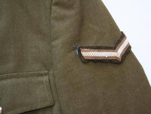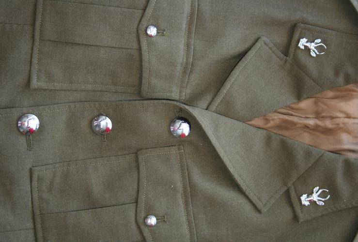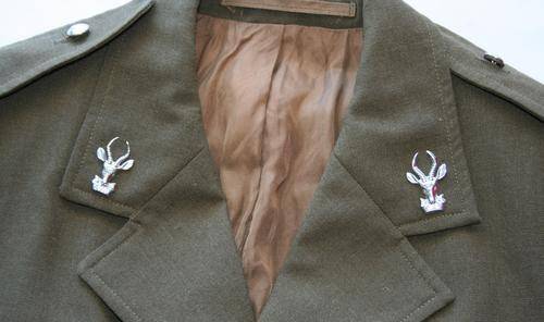 SOUTH-AFRICAN DEFENCE FORCE , ARMY INFANTRY, STEP-OUT TUNIC/JACKET . 1970's AND 80's PATTERN-- GOOD CONDITION. STAYBRITE CHROME BUTTONS AND 2 x SPRINGBOK COLLAR BADGES. THE ONE IS MISSING 1 PIN. ALSO HAS 2 X LANCE-CORPORAL RANK CHEVRONS. SIZE : CHEST 92cm (SMALL) (AS 92)