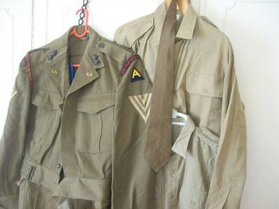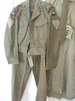 Sadf Sergeants uniform with the insignia of the Cape field artillery on it, it consists of 2 shirts a tie , jacket & trousers which are marked trousers B dress army size 140 ensign ltd 1964. all are in good condition.