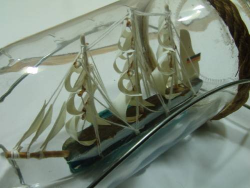 Sail Boat in a Bottle with metal wire stand, 18cm long, vintage 1960's