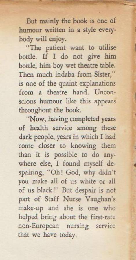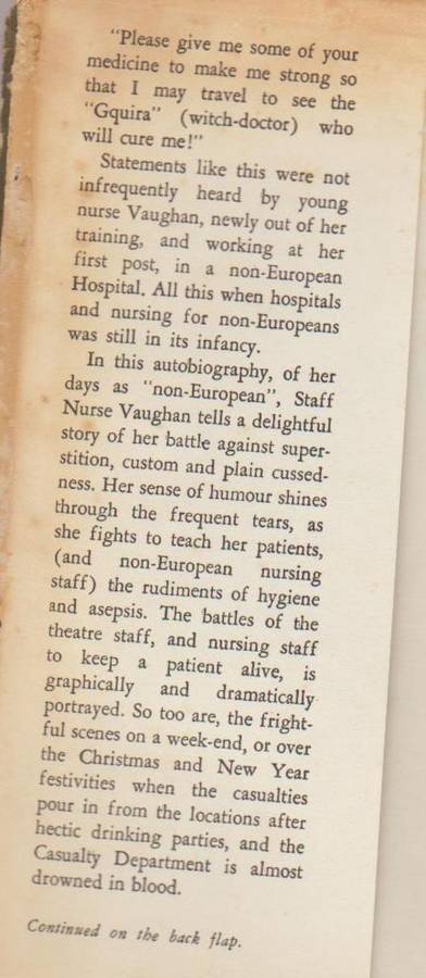 Saku Bona Staffie Nurse By Boyne And Iris Vaughan, My Experiences In An African Hospital, published in 1964, 173 pages, hardcover with dustjacket, much wear/damage to dustjacket, also browning of pages, however all pages are intact and are quite readable.