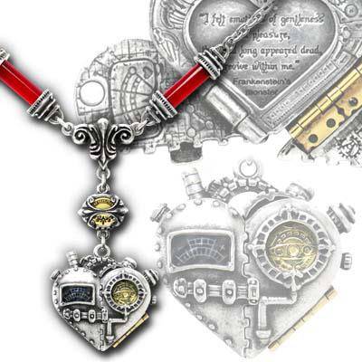 The perfect mechanism of love is encapsulated in this steampunk pendant. With glass rods and brass components, this locket opens to reveal the words of Frankenstein's monster. 'I felt emotions of gentleness and pleasure, that had long appeared dead, revive within me.'
