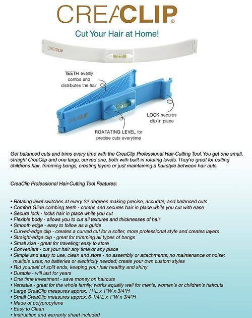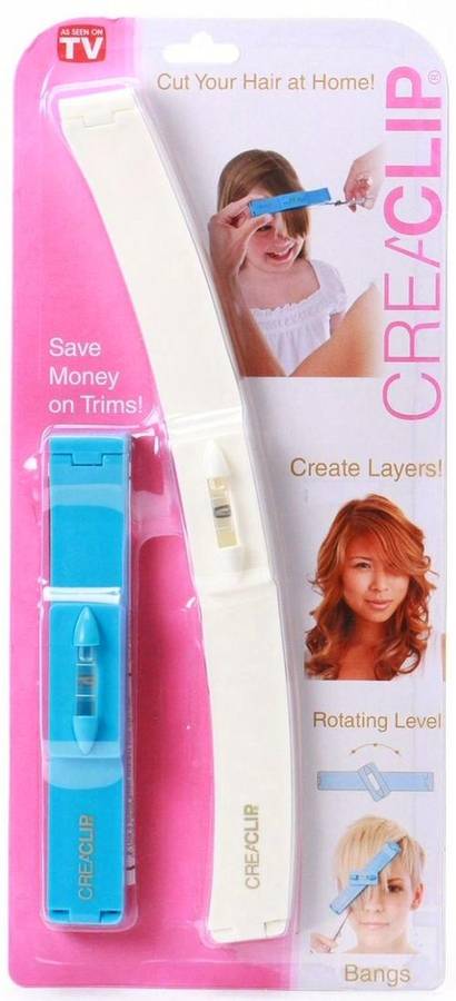 CreaClip is a unisex handy two piece device that lets you cut your hair at home without having the struggle of cutting freehand. Creaclip is a fool-proof guide to where your hair needs to be cut; the right angle, the right shape, and even has a built-level to allow you to cut straight across or at a perfect angle. Cut your own hair at home with professional results. For easy and precise cuts every time! Great for cutting children's hair, trimming bangs, creating layers, or just maintaining a hairstyle between cuts- anytime, any place!