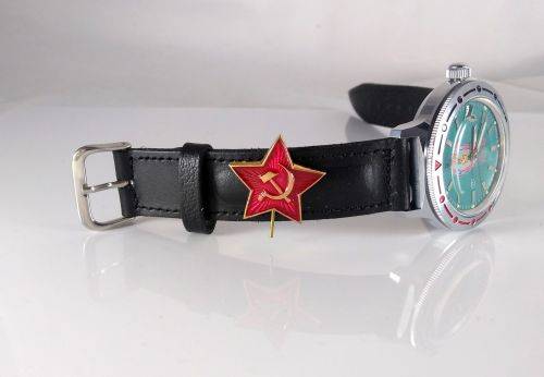 Original Russian Watch "Vostok" "Komandirskie Paratrooper Forces" by Vostok Military Factory, brand new, leather strap, screw in crown. 2 years movement warranty from Babushka Collectables. First 10 watches comes with gift - Collectable Russian enamel star with hammer and sickle. Size: 43 x 42 x 12 mm.