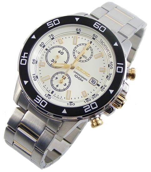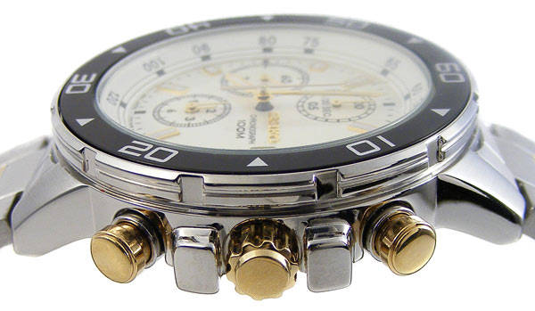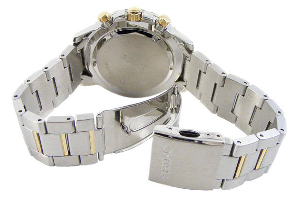 Solid stainless steel case with screw in case back and gold toned crown and chronograph buttons.