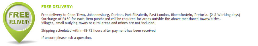 R35.00 Standard shipping using one of our trusted couriers applies to most areas in South Africa. Some areas may attract a R30.00 surcharge. This will be calculated at checkout if applicable.