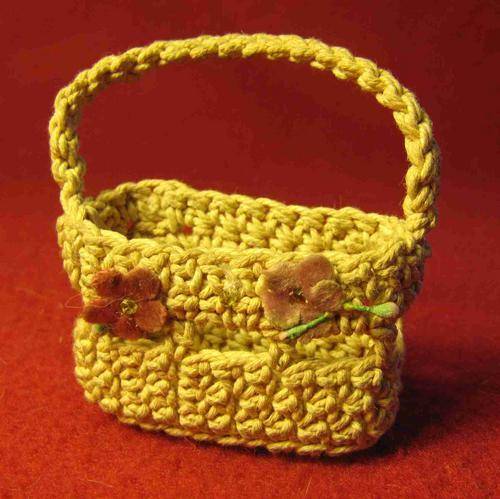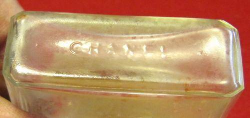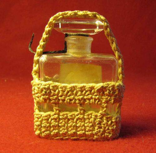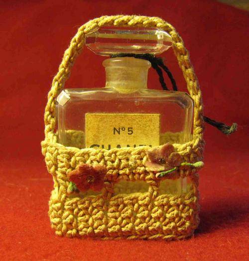 Vintage Chanel No.5 empty Perfume Bottle in Crocheted Basket. The bottle neck and stopper have a ground glass fit. "CHANEL" is moulded into the glass bottle base. The stopper top has a rectangular beveled glass grip. The crocheted basket has small flower decorations.