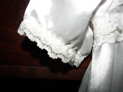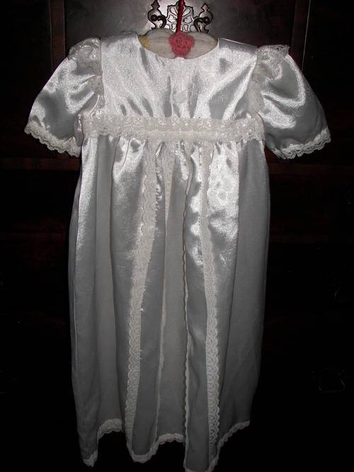 SMALL MARK ON FRONT OF DRESS FROM AN OLD STICKER PRICE..NOT NOTICEABLE REALLY HOWEVER COULD SEW AN EMBELLISHED ROSE / BEAD,ALTERNATIVELY EMBROIDER YOUR BABY'S NAME THERE... FOREVER KEEPS.