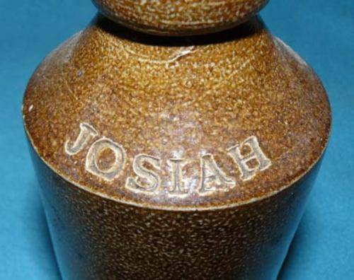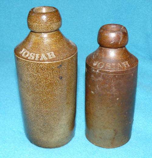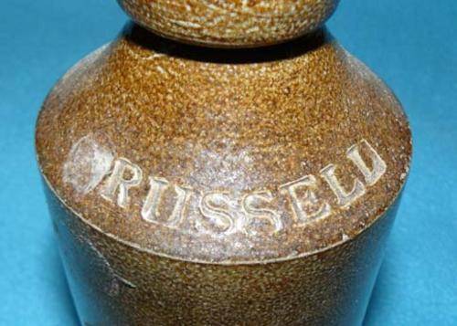 A brown salt-glazed ginger beer bottle for Josiah Russell. The bottle is 19.5cm high and 7.5cm in diameter - slightly larger than the usual blob-top ginger beer.