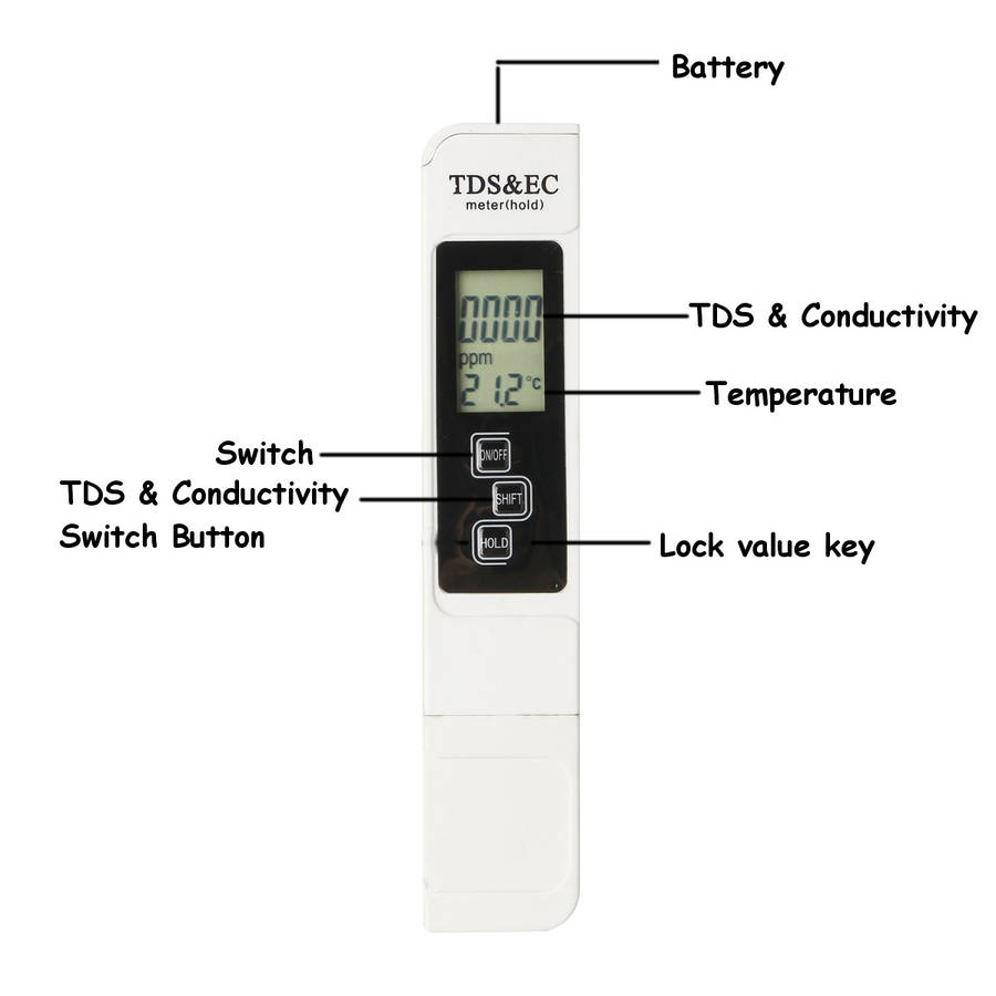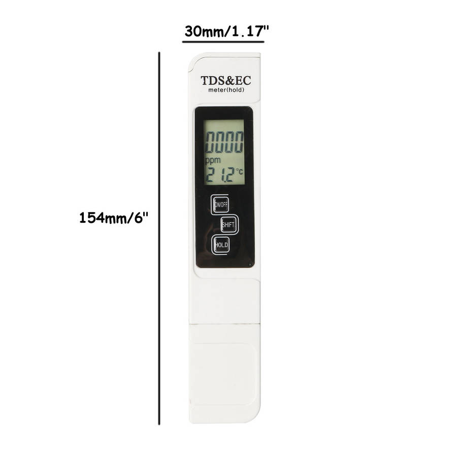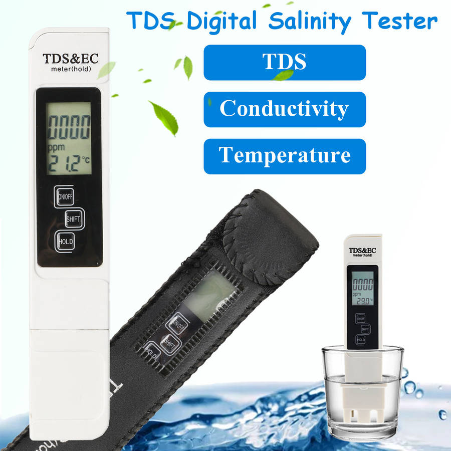 Description TDS Digital Salinity Temp Tester/Meter for Salt Water Pool Fish Pond Testing Specification - Measuring range: 0-9999ppm - Accuracy: 2% - Batteries: 1x 3V button cells - Auto shut-off: 10 minutes - ATC(Automatic Temperature Compensation) - Dimensions: 154*30mm/6*1.17inch Features - Reliable Tech: Automatically calibrated per temperature, 0 - 9999 ppm TDS Measurement Range with 1 ppm Resolution, +/- 2% Readout Accuracy - Data Hold Function: Holds measurement value when moving out of water for convenient reading and recording - Auto-off Function: Shuts off automatically after 10 minutes of non-use to conserve batteries - ATC and Temperature Function: ATC Function promises high accuracy and Temperature Function allows users to get to know the temperature of the the liquid - Portable Design: Lightweight, handheld design for portability and convenience. Package Includes 1 Piece Water Quality Tester 1 Piece User Manual 1 Piece Free Leather Bag